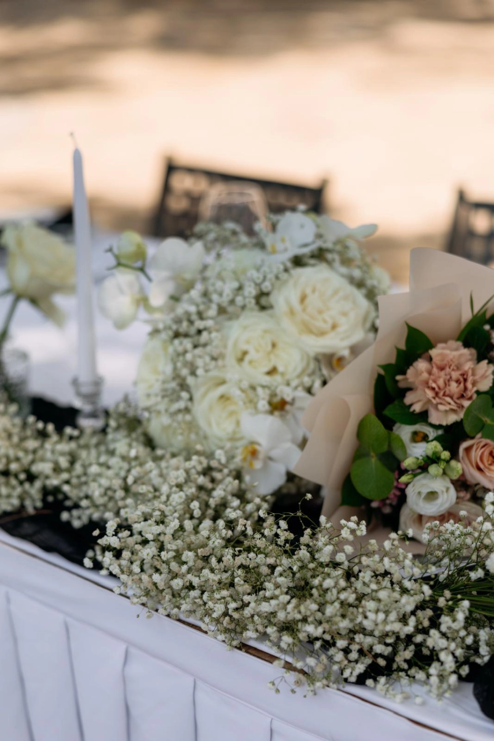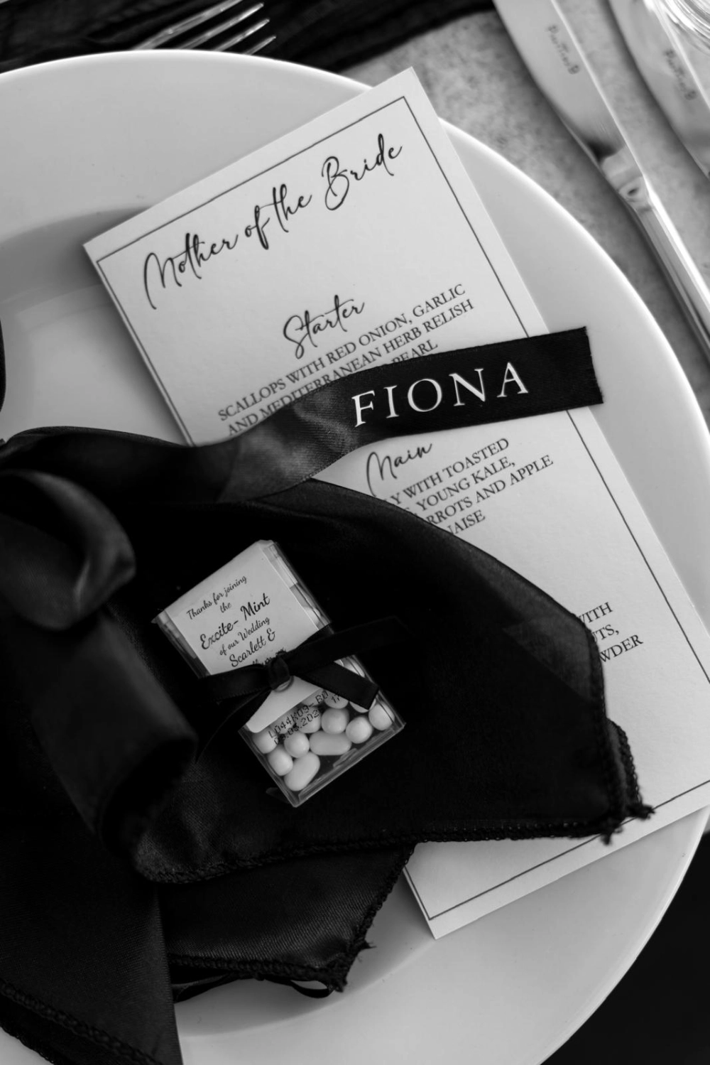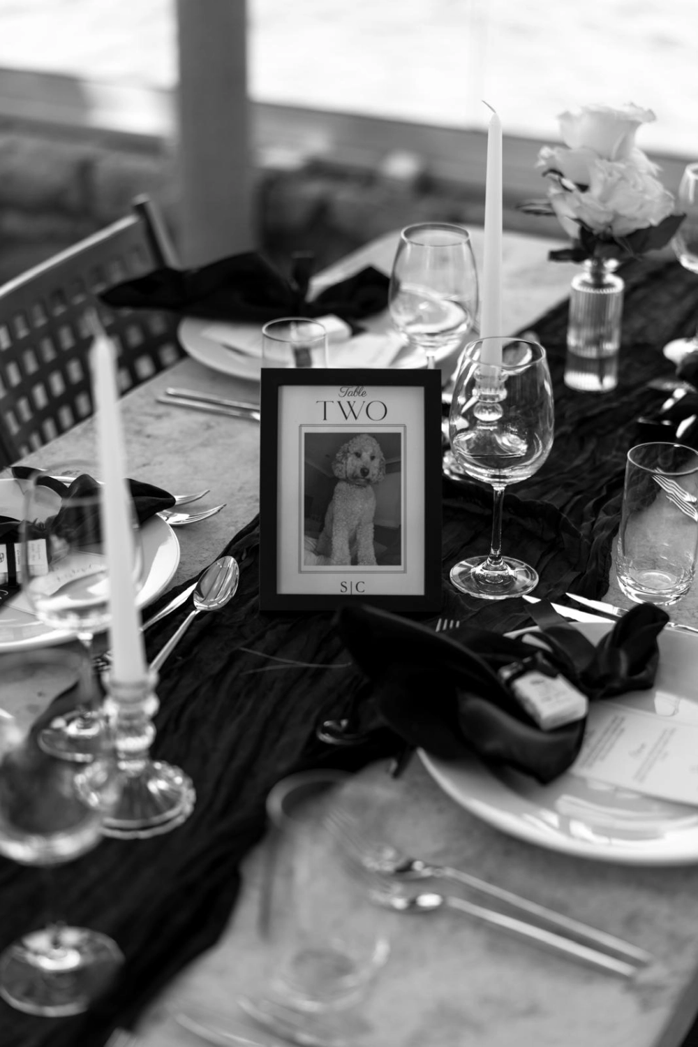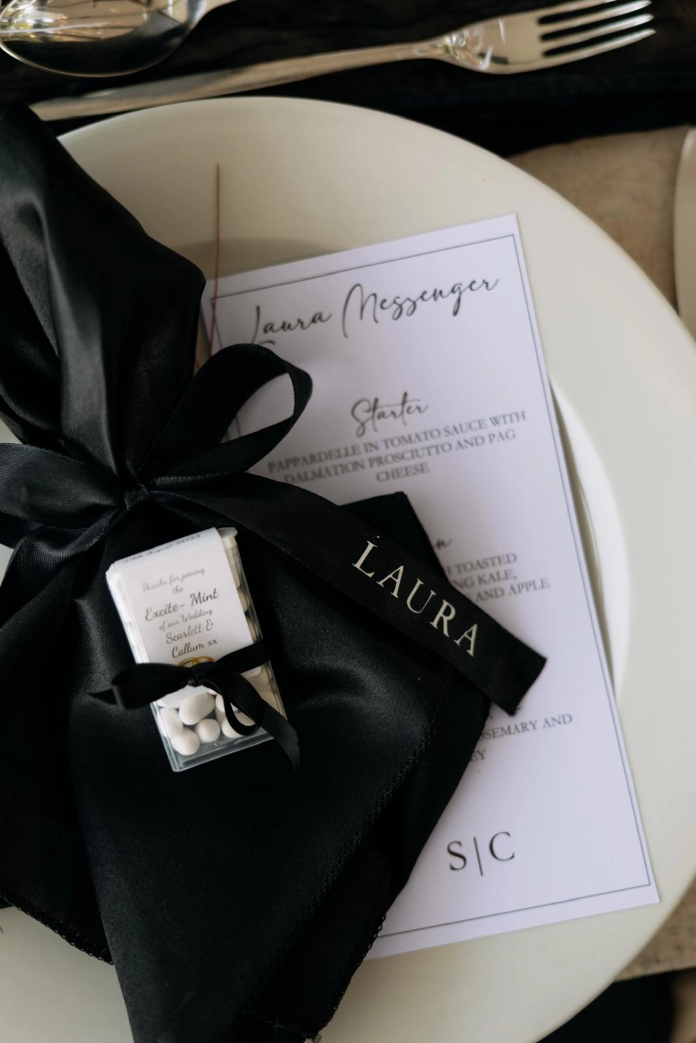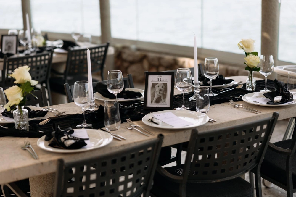 We executed a chic monochrome design using flowing black runners against crisp white linens and natural stone textures. To bring the client’s story to life, we integrated bespoke “pet-centric” table numbers and personalised silk name ribbons for every guest.